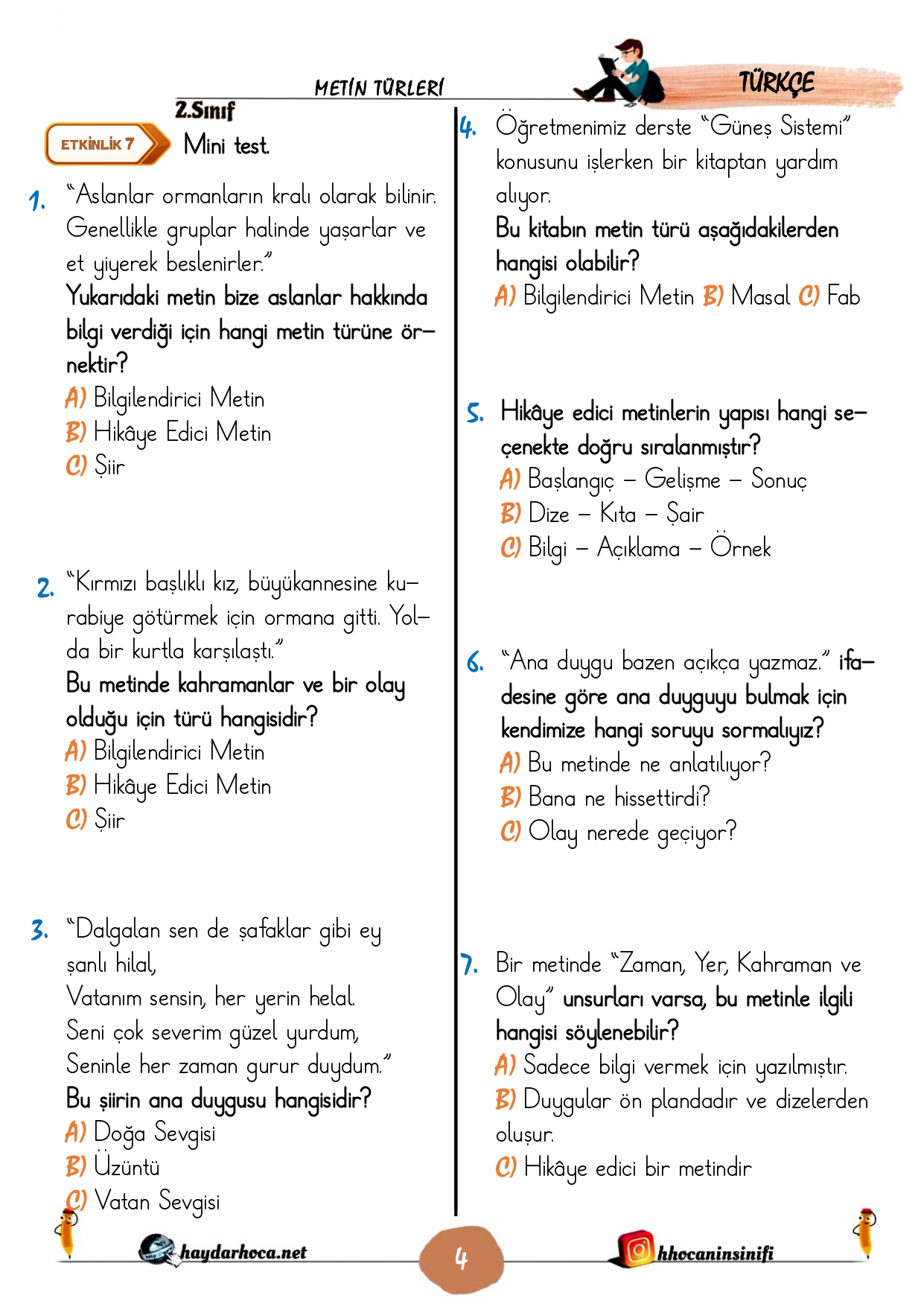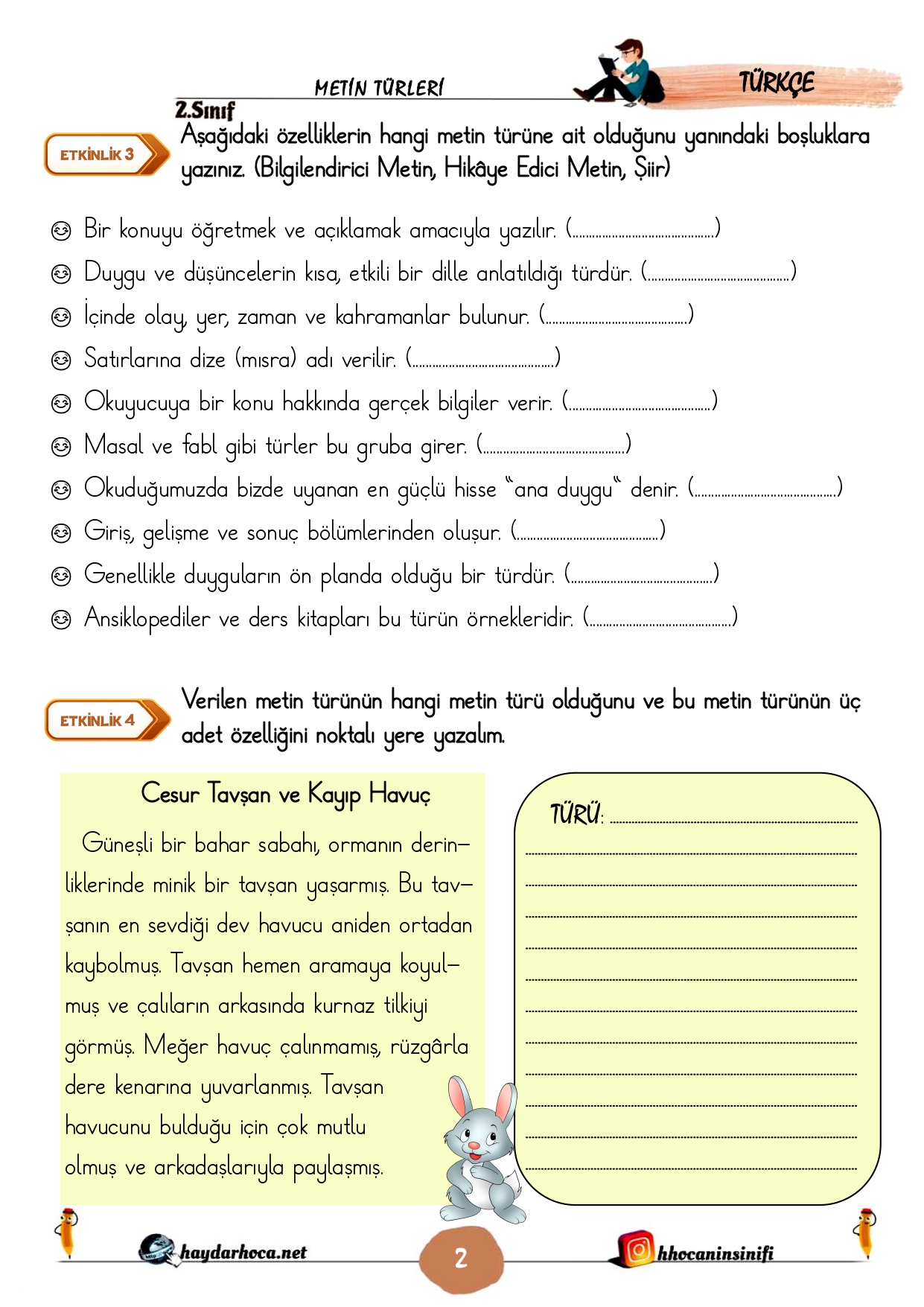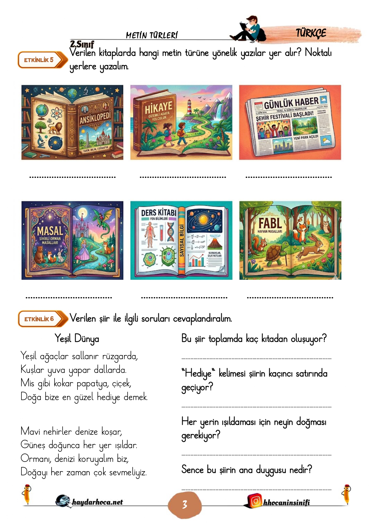 2. Sınıf Türkçe Metin Türleri Konu Çalışmaları (Hikaye edici-Bilgilendirici metin-şiir) 14 Nisan 202614 Nisan 2026Şurada Paylaşıldı: 2. Sınıf, 5) Metin Bilgisi, Türkçe2. Sınıf 28. Hafta Türkçe Metin Türleri defter notuİndir2. Sınıf 28. Hafta Türkçe Metin Türleri Konu Etkinlikleriİndir